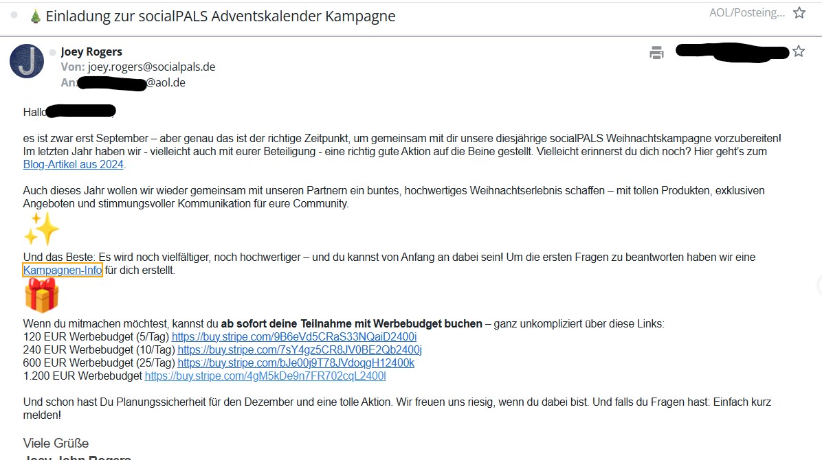 socialPALS-Teilnehmer aufgepasst: Auch in diesem Jahr initiiert unser Dienstleister socialPALS eine Weihnachtskampagne und gibt Händlern die Chance, über die Plattform Gewinnspiele für die eigene Community bereitzustellen. Unter anderem werden in den Mailings Links für die direkte Buchung von Kampagnen-Budget verlinkt.