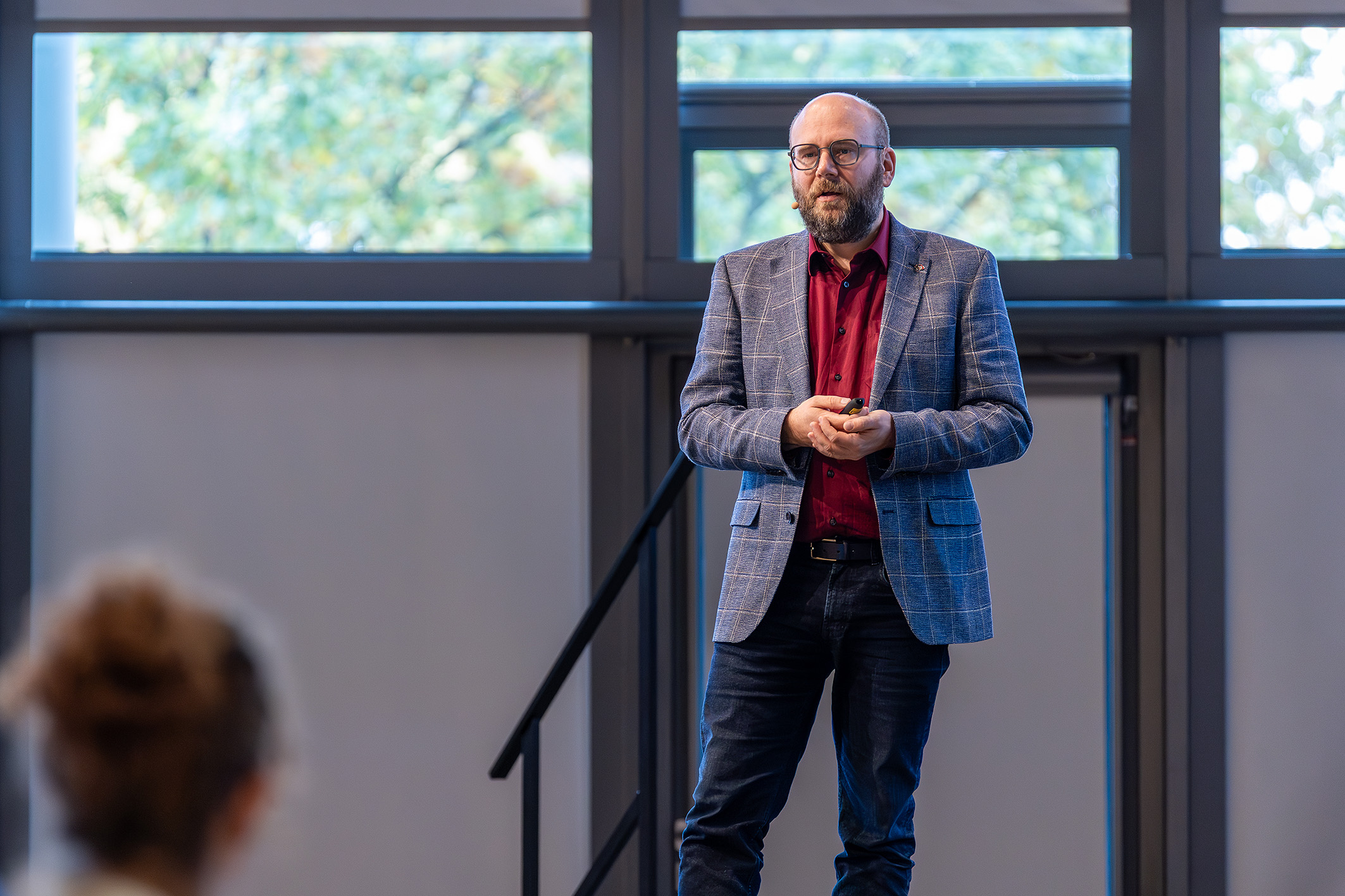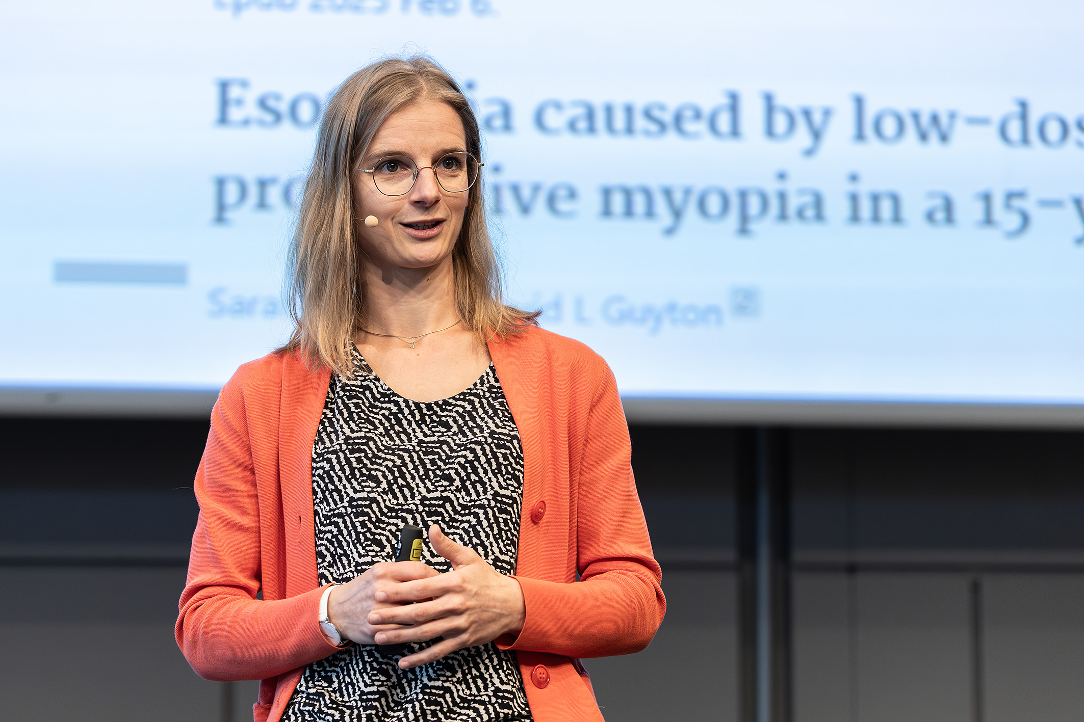 Gustav Pöltner zeigte praxisnahe Anpassstrategien für komplexe Hornhautformen, und Dr. Carolin Truckenbrod beleuchtete die Wirksamkeit und Nebenwirkungen der Atropintherapie zur Myopie-Prävention. Nach der Kaffeepause folgten Beiträge, die den interdisziplinären Charakter der Optometrie unterstrichen: Eef van der Worp, PhD, erläuterte aktuelle Entwicklungen bei Sklerallinsen, Dr. Oliver Kolbe stellte optometrische Methoden in der Rehabilitation bei Gesichtsfeldausfällen vor, und Loreen Roth zeigte den Zusammenhang zwischen Stereopsis und Raumwahrnehmung auf. Am Nachmittag lud Martin Kündig mit interaktiven Fallbeispielen unter dem Motto „Was würdest DU tun?“ zum Mitdenken ein, bevor Prof. Dr. Dr. Ludwig Heindl mit einem Vortrag über Irisläsionen und moderne Diagnoseverfahren den Tag abrundete.